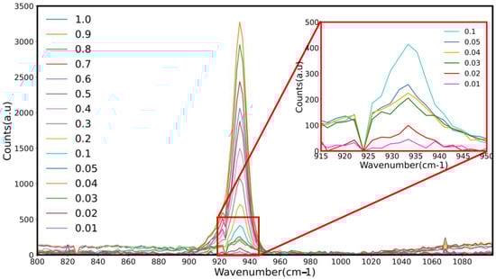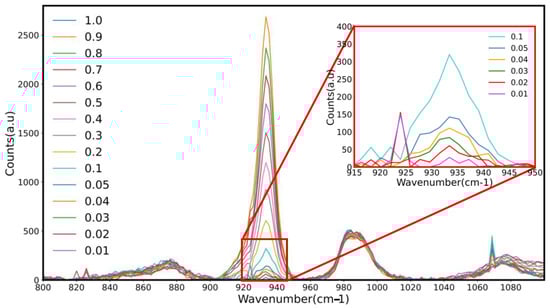 A Raman spectra with over-lapping peaks showing differences in peak heights associated with the varying percentages (0.01–1%) of sodium perchlorate in Davis minimal medium used in the creation of a standard curve. Raman spectra of the concentrations from 0.01 to 0.1% are shown in inset.