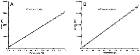 The novel use of Raman spectroscopy in this experiment (see experimental set-up in Figure 1) for the detection of perchlorate within solution, pre- and post-metabolism, was found to be a robust and reliable detection method. Standard solutions were created for assessing perchlorate detection and linearity in a solution ranging from 0.01 to 1% (as seen in Figure 2 and Figure 3). The resulting R2 values of each graph were close to 1.0 (see Figure 4A,B), thus confirming the robustness in the detection technique and was deemed fit for use in the detection of microbial-based sodium perchlorate metabolism. Therefore, not only is the Raman spectroscopy sensitive enough to detect concentrations of as little as 0.01% perchlorate, it is also robust and with acceptable linearity for perchlorate quantification via extrapolation from the standard curve. As previously stated, Martian perchlorate levels have been found to range from 0.4 to 0.6% [], thus confirming the sensitivity of the Raman probes perchlorate detection capabilities (as low as 0.01%). While this study is able to detect Martian-specific perchlorate concentrations, if Raman was to also be employed terrestrially within environmental settings (to detect perchlorate pollution from public water systems, munitions manufacturing or agriculture [,,,,]), while situation dependent, its use has its limits. Within the confines of this study, it has been shown that the Raman probe is capable of detecting perchlorate concentrations as low as 100 mg/L (0.01%). Again, the degree of perchlorate contamination itself corresponds to the amount of human activity and perchlorate generation. Natural terrestrial soil perchlorate levels (within arid environments) have been documented to range from 0.03 to 0.1% (300–1000 mg) [], thus reaffirming the robustness of Raman detection measures terrestrially in mediums beyond the broth and RODI water examined within this study. It also reaffirms the use of Raman to detect microbial perchlorate reduction levels within the range of the standards used. However, it must be stressed that the use of Raman for perchlorate detection levels below 100 mg/L is yet to be examined and may prove to be unreliable. This highlights the need for future lab-based work investigating the limits of detection of perchlorate both within a water/broth sample and within the environment also.