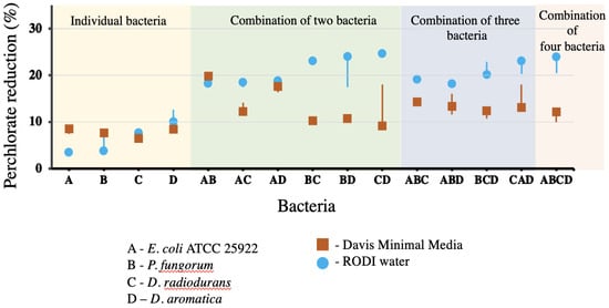 A plot showing the recorded transformed extrapolated Raman data denoting the percentage of perchlorate reduction within Davis minimal medium (red data symbols) and RODI Water (blue data symbols) when metabolised by the individual strains (A–D) and combined strains (AB–ABCD). Symbols denote the median, while error bars denote the range.