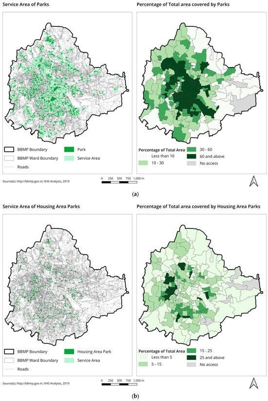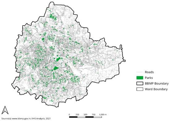 By attempting to build on the scarce data on public parks made available by the Bengaluru urban administration, the mapping of public parks was conducted using a geographical information system (GIS). This was further correlated with road network data to shed light on the parks’ range of accessibility for residents, correlating it with their socio-economic parameters. The geospatial technique used to map the parks draws on the methodology followed by Iraequi et al. []. We are, however, constrained by the unavailability of data on income, migrant populations, and age groups, at the ward level, from government sources. Only district-level data are available for these parameters, which are insufficient for this analysis. Therefore, ward-level 2011 Census data on population density, the percentage of children below the age of six years, the proxy wealth index, and scheduled caste population were considered to understand their association with the accessibility of public parks.
