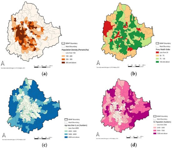 To evaluate the association between the accessibility of public parks and socio-economic disparity within the city, the data on four parameters from the 2011 Census [], available at the ward level, have been used: population density (Figure 2a), proxy wealth index (for the proxy wealth index calculation, please refer to the methodology section of the study by Bhan and Jana []) (Figure 2b), the percentage of the population under six years of age (Figure 2c), and the scheduled caste (SC) population (Figure 2d). A description of these parameters is provided in the methods section of the Supplementary Materials. Further, a spatial correlation—i.e., Local Indicator of Spatial Association (LISA)—between the access to parks and these socio-economic parameters has been analyzed and mapped. The detailed method of Bivariate LISA Morgan-I statistics used is provided in the methods section of the Supplementary Materials. This result is meant to capture the accessibility to different types of parks of different socio-economic groups of residents in the city. These visualizations help in identifying areas deprived of public parks and also highlight whether there are urban planning attempts to cater to areas of high population density or whether the accessibility of public parks is skewed towards a specific socio-economic group.