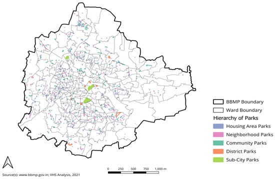 The dataset published by the Bruhat Bengaluru Mahanagara Palike (BBMP) [], i.e., Bengaluru’s city corporation or urban local body, on the public parks falling under its jurisdiction was used to perform the spatial distribution. This was the starting point of our methodological process. This dataset lists the name of the park, the zone it is in, its ward name and number, the area it covers and, for some, a description of its quality. We began spatially mapping these parks by first recording the 1288 of parks listed in the BBMP dataset (BBMP: https://site.bbmp.gov.in/documents/Detailsofparklist.pdf accessed on 19 September 2018). However, crucially, this list was last updated in 2015. Therefore, this list alone is woefully inadequate for obtaining an accurate picture of the green spaces in Bengaluru, especially considering the rapid pace at which the city is urbanizing and expanding outwards to its peripheries. This outdated official data necessitated georeferencing via high-resolution Google Earth Imagery. The detailed methodology followed for mapping the public parks to understand their spatial distribution has been provided in the methods section of the Supplementary Materials. Further, the spatial data of these parks was analyzed based on the hierarchy of the parks, shown in Table 1, with the ideal population coverage and service area requirements of different parks being based on the Urban and Regional Development Plans Formulation and Implementation (URDPFI) guidelines [].