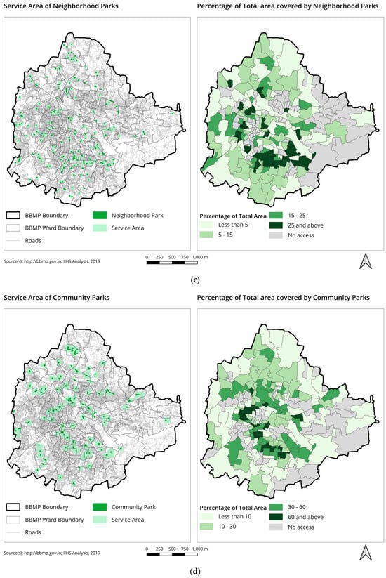 Our study used a GIS to map public parks as there is lack of local data on green spaces. Studies on the availability of and equitable access to UGSs are rare in the Indian context. The study conducted by Gutiérrez et al. [] in a metropolitan area of Mexico used a similar methodology to map green space distribution using ArcGIS and measured its accessibility using network analysis. Their results are consistent with our study: a low quantity of green spaces and their uneven distribution result in the inaccessibility of these spaces for a larger proportion of the city’s population. A similar study on the accessibility of UGSs in Mysuru city by Yashaswini and Shankar [] showed almost consistent results. The uneven distribution of public parks in Bengaluru is clear from the spatial distribution analysis, which revealed, of a total of 198 wards, that about 19 wards have no parks and 36 wards have 1 park. Most of the neighborhood parks—which are most convenient to access by walking (within 400 m)—performed the worst with regard to their number, area coverage, and accessibility. It is often assumed that people utilize parks if they are accessible by walking, but this is inconsistent with the study by Paul and Nagendra [] conducted in the national capital, Delhi, which revealed that 54 percent of visitors who accessed the surveyed parks visited from more than 1 km away and about 33 percent visited from more than 10 km. Therefore, based on our study, it cannot be concluded that the parks that are inaccessible are not utilized (as most of the neighborhood parks and community parks are inaccessible).