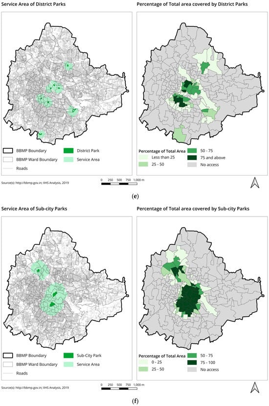 The overall accessibility of these parks, as depicted in Figure 5a, revealed that the central part of the city has 100 percent accessibility. The two parks located in the central part of the city, i.e., Lalbagh Garden and Cubbon Park, cover a larger service area because they are bigger in size and thus have a larger service area in terms of accessibility. The service area analysis of the hierarchy of parks is shown in Figure 5b–f. This service area analysis revealed that 178 (90 percent) wards are covered by at least 5 percent of the service area of housing area parks, 30 (15 percent) wards by 100 percent of the service area of sub-city parks, and 8 (4 percent) wards by 100 percent of the service area of district parks. The bigger the park, the better its accessibility.