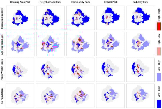 Figure 6 displays the LISA maps for each socio-economic parameter (in rows) and each one of the UGS categories (in columns). Therefore, the first row displays the significant co-occurrences of high/low accessibility and high/low population density across five different UGS categories. The neighborhoods shown in dark red (high–high) have high accessibility and a high value for their socio-economic parameter, whereas those in light red (high–low) have high accessibility and a low value for their socio-economic parameter. In addition, the areas shown in dark blue (low–low) have low accessibility and a low value for their socioeconomic parameter, while light blue areas (low–high) have low accessibility but a high value for their socioeconomic parameter. Only neighborhoods that are statistically significant are colored.