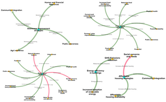 Due to the system map’s high complexity and the time limitations of workshops, the complete system map was divided into four sub-systems (see Figure 4) based on the strategies’ areas: food, climate actions, biodiversity conservation and health, and governance. In these maps, strategies are depicted using blue ovals and outcomes are depicted using orange rectangles. The links between strategies and outcomes are illustrated with black (positive links) or red (negative links) lines. The purpose of creating these sub-system maps was to create visualizations that better facilitate comprehension of the system by focusing on one planning and policy area. When reviewing the sub-system maps, participants engaged in thinking about how their planning and policy area impacts other areas; thus, they still engaged with the full system without needing to review the whole system map (which can be visually overwhelming due to its complexity).
