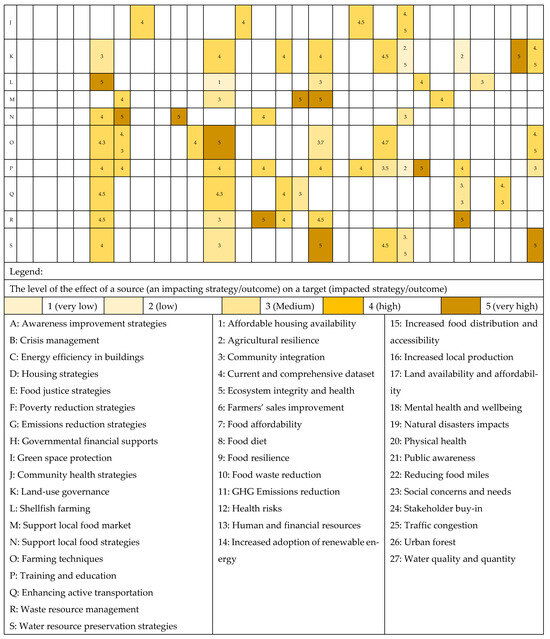 Insights into the development of the system map were also gained via the exercise where all stakeholder workshop participants rated the strength or importance of a relationship. The majority of strategy-outcomes relationships were given a rating of 4 and 5. This means that they are recognized as influential ones in other areas and should be considered in developing future strategies. Figure 6 shows the mean ratings for each outcome. Sources are shown in the first column of this table and targets are placed in its first row. According to these results, it seems even the recognized links that appear less than two times in the interview data are important and not negligible with respect to their influence on the system, meaning that ignoring links just because they show up in the data infrequently is not a reliable method for developing a robust system map.