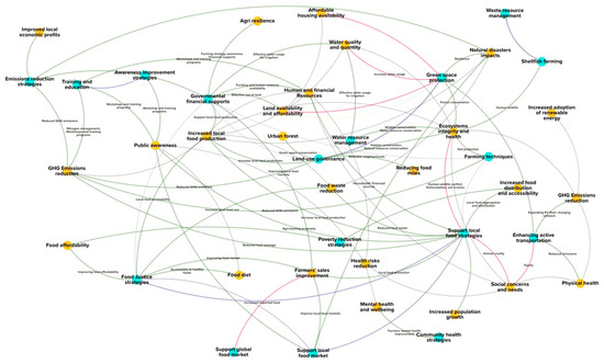 Participants commented on challenges navigating the system map. The maps contained legends with sub-categories of each node to help participants understand the different aspects of the visualized system; however, the process of finding each node at the legend and returning to the system map adversely influenced participants’ comprehension. Additionally, participants of the first workshop explained some nodes are vague, and there is a need to review the nodes’ chosen names. It was mentioned that the scales of nodes are different, and in some cases, the chosen names include meaning more than their sub-nodes. Additionally, comments were made about how relationship types (positive or negative) were displayed with no directionality toward the outcomes. For example, the use of a green line to show co-benefits between food justice strategies and food miles was not found clear by participants, and instead, they suggested showing the direction of outcomes by writing ‘reduced food miles’ in this case:
