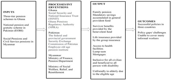 Retirement decision-making, retirement transition, and retiree satisfaction have been the subject of numerous theoretical arguments. Some of these theories include disengagement theory, life-course perspective, and role theory. Much research has been conducted on retirement, but not on the theoretical postulates of comparative pension research. Therefore, this study used a theory of change to analyse pension schemes for older people in Ghana, Pakistan, and Myanmar. The cases shown in Figure 1 demonstrate how the theory of change (input, output, and result) in policy analysis can be implemented in practice.