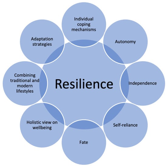 - Cueva, K.; Akearok, G.H.; Guistini, S.; Kanayurak, N.; Larsen, C.V.L.; Lavoie, J.; Rink, E.; Stoor, J.P.A. Where are the people? A scoping review on the use of the term “resilience” in Arctic health research and its relevance to community expressions of well-being. Elem.-Sci. Anthr. 2021, 9, 00077. [Google Scholar] [CrossRef]