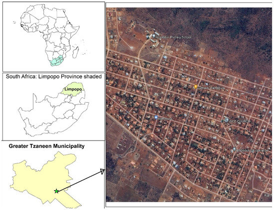 Study area map of Mafarana village (green star) in the Great Tzaneen local municipality (yellow).