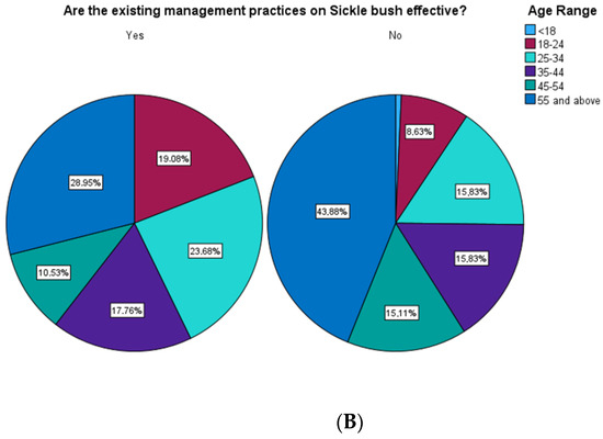 On the other hand, the data presented in Figure 3B reveal the perception of the effectiveness of current management practices for handling sickle bush, which include cutting of the plant, uprooting, and burning of the biomass. This is reported to be a more effective way of managing sickle bush as an encroacher plant. Among the respondents who answered “yes” to this question, a significant proportion of individuals aged 55 and above expressed agreement with the current management practices’ effectiveness. This discovery aligns with a study by Tenagyei [45] which found that farmworkers in semi-arid Ghana perceive indigenous techniques to be effective for managing farmlands. Although certain studies indicate that methods of managing problematic plants through cutting, uprooting, and burning are highly effective and successful, they also highlight the challenge associated. Invasive and encroacher plant species tend to invade freshly cleared or burnt areas easily due to exposure of the dormant seed to direct sunlight, water, and veld fires that stimulate the germination of seeds [46,47]. Moreover, the method has been proven to have detrimental long-term environmental implications for the soil as it causes soil erosion and environmental degradation [48].