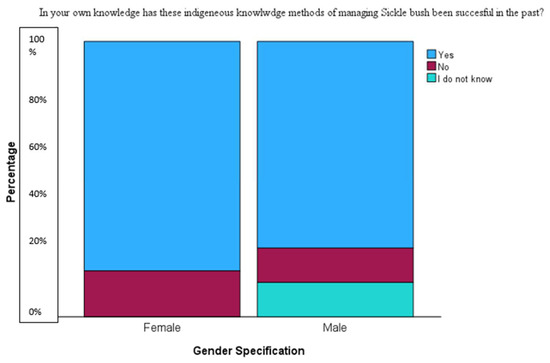 Based on the results shown in Figure 5, it is apparent that indigenous knowledge systems have a track record of success in effectively managing sickle bush. Analysis of the responses reveals a significant gender-based difference in perceptions. Among female participants, a substantial 80% expressed confidence in the efficacy of these indigenous methods, while only 20% disagreed. Conversely, male respondents displayed slightly varied opinions, with 75% believing in the success of indigenous knowledge methods, 10% expressing disagreement, and 15% remaining uncertain or without a clear stance. While both genders predominantly perceive the effectiveness of indigenous methods, the levels of agreement and uncertainty differ noticeably. These findings align with Tanyanyiwa’s [50] findings that indicated that indigenous knowledge systems play a crucial role in managing forest resources, particularly in controlling invasive species like sickle bush. For sickle bush, leveraging indigenous knowledge systems could offer sustainable and effective management strategies. Furthermore, indigenous communities have a rich body of traditional ecological knowledge that includes information about plant and animal species, their interactions, and the overall functioning of ecosystems. This knowledge is often passed down orally from one generation to the next. Indigenous people are often the first to notice changes in their environment [51]. Their close connection to the land allows them to identify invasive species and other problem plants like sickle bush early on, facilitating prompt intervention before the invaders cause significant ecological damage.