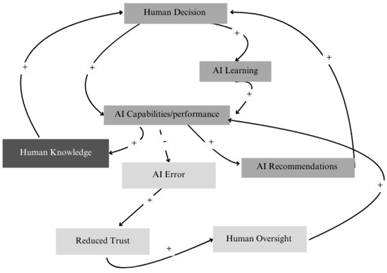 Causal loop diagrams (CLDs) provide an elegant approach for visualising and analysing the complex dynamics between humans and AI in decision-making systems. As visual tools that represent interdependent variables and their relationships, CLDs help us move beyond linear thinking to understand the emergent behaviours arising from feedback loops in complex systems. The diagrams consist of nodes representing key variables connected by arrows showing causal links, with loops that can be either reinforcing (positive) or balancing (negative). Reinforcing loops depicted by positive signs (+) are self-amplifying, while balancing loops depicted by negative signs (−) are self-correcting. CLDs are helpful in visualising complex systems and identifying nonobvious virtuous or vicious cycles created via feedback loops. CLDs therefore can be used to describe the basic causal mechanisms which generate system behaviour over time [58]. They also help people to break away from linear thinking towards systems thinking. The earlier example of two nations who hate each other because they do not get to know each other, and will not get to know each other because they hate each other, is a clear illustration of a reinforcing feedback loop or vicious cycle, in which the initial lack of knowledge leads to hate and that hate then prevents actions that would lead to increased knowledge such as communication and cultural exchange. The continued lack of knowledge further reinforces the hating attitude and perpetuates the cycle.