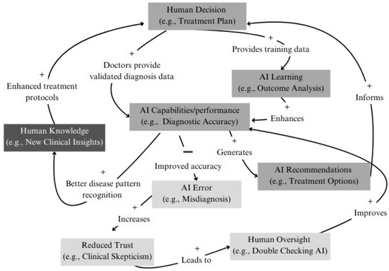 To illustrate the practical application of this model, let us consider the healthcare domain (Figure 2). Here, the core learning loop manifests as medical professionals making treatment decisions and recording outcomes, which improves AI diagnostic capabilities. Their interactions with AI tools provide valuable feedback for algorithm refinement. The trust oversight loop becomes particularly critical: if an AI system misidentifies a tumour, decreased trust leads to enhanced review processes that ultimately improve accuracy. The recommendation loop shows how AI can analyse patient data to suggest treatment options that doctors evaluate using their expertise, leading to AI learning and improvements in future recommendations. The negative loop indicates that an increase in AI capabilities/performance leads to a decrease in AI errors.