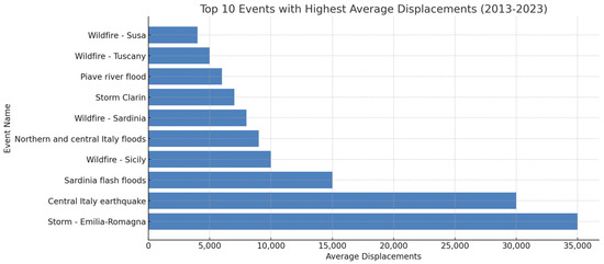 Figure 2 illustrates the ten most significant events in Italy, delineating the highest average displacements between 2013 and 2023. This provides a comprehensive representation of the extent to which specific disasters have resulted in extensive disturbances. This visualization elucidates the profound impact of disparate natural phenomena, particularly storms, earthquakes, and floods, on population displacement. It also underscores the susceptibility of Italian communities to both abrupt and climatic-related hazards. The Emilia-Romagna storm of 14 May 2023, is notable for its exceptionally high average displacement, illustrating the severity and far-reaching impact of this severe weather event. The storm, which brought unprecedented precipitation levels, resulted in extensive flooding across the region, necessitating the evacuation of thousands of individuals from their homes and causing considerable damage to infrastructure.