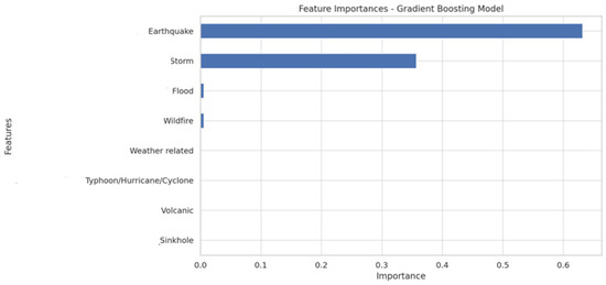 Figure 3 illustrates the IS derived from the Gradient Boosting Model and elucidates the hazard types that exhibit the greatest predictive capacity with regard to displacement. This analysis identifies earthquakes and storms as the two most influential features, exhibiting a significant lead over other hazard types. The “Earthquake” feature is of the greatest importance, indicating that earthquakes are the most influential variable in predicting displacements. This finding is consistent with observations in the real world, where earthquakes often result in significant displacement due to their immediate and devastating impact on infrastructure and habitability, particularly in areas with high seismic activity.