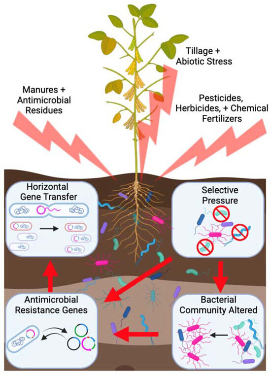 Mechanisms of antimicrobial resistance in soil microbiota. Chemical inputs, including pesticides, herbicides and fertilizers, exert stresses on bacteria, alter the composition of the bacterial community, and select for resistance to other antimicrobials, including those used in medicine. Animal manures contain resistant bacteria and antibiotic resistance genes (ARGs) that further alter the soil microbiome. ARGs can spread through the bacterial community via horizontal gene transfer. Figure generated using BioRender.com. (biorender.com. accessed on 10 April 2025).