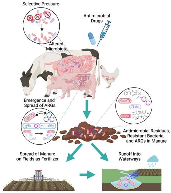 Alteration of animal microbiota by antimicrobial drugs and spread into the environment and food via use of manures as fertilizers. Antimicrobial drugs exert selective pressures that drive antimicrobial resistance in animal microbiota, leading to the emergence and spread of antibiotic resistance genes (ARGs). These resistant bacteria, antibiotic residues, and ARGs persist in manures, which are then used as fertilizers. These can then alter soil microbiota and spread throughout waterways via runoff. Figure generated using BioRender.com.