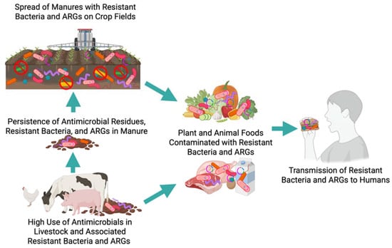 Animal derived food products, such as dairy, meat, and eggs, have been demonstrated to carry zoonotic pathogens and associated ARGs [8,75,76,77]. Thus, transmission of zoonotic pathogens with acquired ARGs from plant foods contaminated with animal wastes and animal foods is a growing concern as depicted in Figure 3.