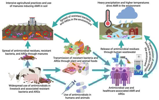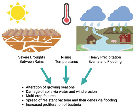 Global climate change is projected to exacerbate the development and spread of AMR through multiple mechanisms. Rising temperatures increase the rate of bacterial proliferation and increase the risk of infection, as seen in rising incidence of infection in summer months [84,85]. In addition to the rising temperatures, climate change increases the occurrence of extreme weather events with heavy precipitation and subsequent flooding, which increases waterborne transmission of bacteria and their ARGs [86]. Increases in extreme weather events, including droughts and flooding, undermine the productivity of our agricultural systems [87]. Not surprisingly, the warmer and wetter ambient conditions and increased flooding due to climate change create a breeding ground for drug-resistant bacteria, spreading AMR [88,89,90] and increasing the likelihood of infection while compromising our food systems, collectively spelling disaster (Figure 4).