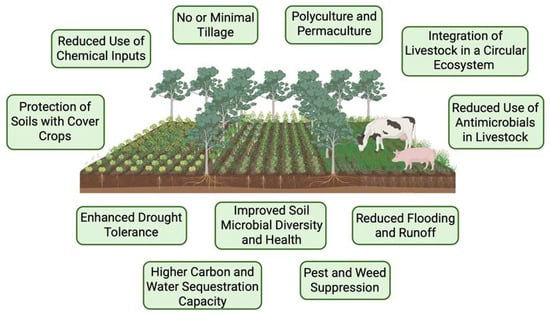 Regenerative agricultural practices introduce biodiversity through polyculture and do not rely on chemical and antimicrobial inputs and thus do not exert the same pressures driving antimicrobial resistance. Planting of permaculture, groundcover, and trees in the practice of agroforestry enhances biodiversity while providing enhanced resilience to extreme weather and pests. These practices promote soil health and do not involve extensive tillage of soils. Incorporation of livestock in agroforestry in the practice of silvopasture reduces the need for antimicrobials and the accumulation of animal wastes. These forms of agriculture collectively improve the health of soils. Image generated using BioRender.com. (BioRender: Scientific Image and Illustration Software) (https://www.biorender.com/ accessed on 10 April 2025).