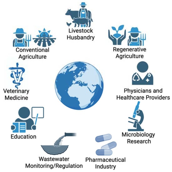 Solutions to antimicrobial resistance require efforts and communication among multiple stakeholders worldwide. Images generated using BioRender.com. (BioRender: Scientific Image and Illustration Software) (https://www.biorender.com/ accessed on 10 April 2025).