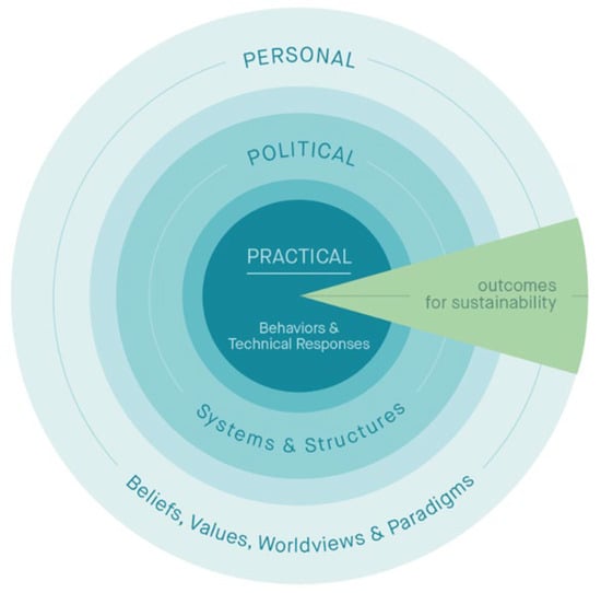 In systems theory, the personal factors which influence human behavior have been identified as internal dimensions—the collection of mental states which include individual values, beliefs, and worldviews [15,30,64]. This identification of the connection between internal dimensions and external work was modeled in the Three Spheres of Transformation structure developed by O’Brien and Sygna [30], as shown in Figure 1. Conceptualized as three nested spheres or fields of change—personal, political, and practical—the largest sphere represents the personal field of change. Here is where the deepest leverage points reside—within the internal dimensions identified as individual beliefs and values, as well as shared worldviews, and paradigms.
