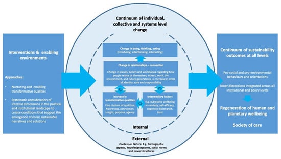 Acknowledging the complexity and interconnection of factors involved in this gap between internal dimensions and external work, Wamsler et al. [64] expanded upon the nested spheres to develop a model for future research, policy and practice (see Figure 2). Identifying both inner and outer factors which influence the process of external systems change, it represents facilitating factors as the initial element of the model. Empasis is placed upon supporting and catalyzing the progression of inner–outer change toward sustainability while acknowledging that the central process within transformation focuses on inner dimensions [15].