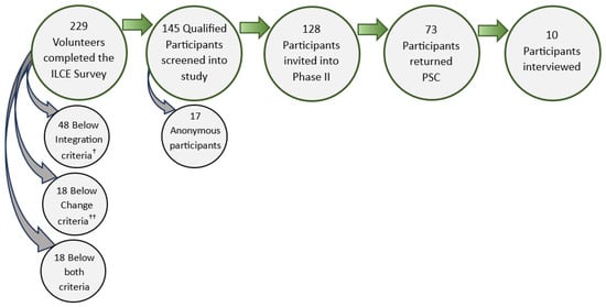 Phase I produced a final sample containing 145 qualified participants, each having demonstrated a satisfactory degree of integration following an authenticated experience of personal transformation. Participants who provided contact information (n = 128) were invited into Phase II, as illustrated in Figure 4, and asked to complete a brief online researcher-designed open-text survey identified as Perspective on Social Change (PSC). The selection of interview participants will be discussed in the Qualitative section below.