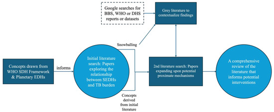 A second literature search was then conducted utilising keywords informed by themes and concepts derived from the initial cohort of articles. This stage broadened the scope of the review to include studies that provided insight into the mechanisms identified from the first literature search. Notably, these articles may not have been explicitly related to TB or Bangladesh and from disciplines other than public health and epidemiology—engineering, nutrition, gender studies, behavioural science, and more. Source types were also expanded to include conference papers, dissertations, working papers and grey literature. This process facilitated a more granular understanding of the dynamics influencing the TB burden. Grey literature was incorporated to contextualise findings; in particular, national survey data was utilised to estimate the scale of a given SEDHs’ influence on the TB burden. These sources were identified through snowballing and targeted web searches and included documents from institutions such as the Bangladesh Bureau of Statistics (BBS), the World Health Organization (WHO), and the Bangladesh Demographic and Health Survey (DHS). Snowballing was used to identify additional sources cited in relevant literature (Figure 2).