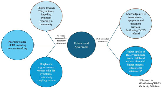 Lower levels of education are linked to widespread misconceptions about TB and heightened stigma towards TB patients, particularly women, both of which can delay treatment-seeking in the community and reduce adherence to prescribed regimens. These factors contribute to the disproportionate TB burden among low-SES populations, specifically those with limited formal education.