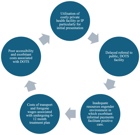 Firstly, the drivers behind presentation of low-SES populations to private healthcare and IPs are also somewhat unclear. While high informal payments [58] and long waiting times [59] associated with DOTS are potentially burdensome for low-SES TB patients and contribute to the treatment barrier cycle (Figure 5), user charges, improper referral and treatment and lengthy travel times at private hospitals [50] could likewise act as deterrents to seeking care at these facilities. Therefore, further qualitative research—particularly interviews or longitudinal patient journey mapping—could provide clarity on the relative influence of these barriers.