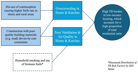 The high prevalence of kutcha housing [75] and urban slums [76] as residential units underscores the significant role of inadequate housing in driving TB disparities among low-SES populations through the amplification of poor air quality and deterioration of urban health.
