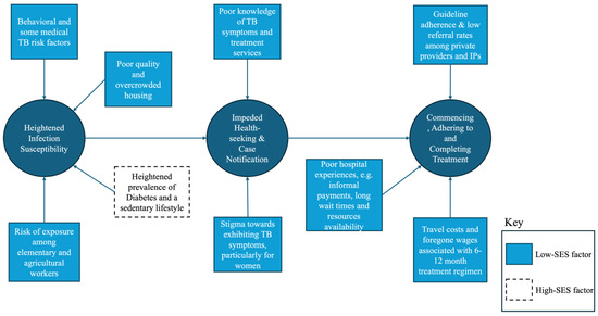 This review explores the five IDHs that modulate TB burden in Bangladesh and represent the overlapping influence of SEDHs. These represent a comprehensive account of the link between low-SES and higher TB burden, corroborating, summarising and synthesising the existing literature base. These mechanisms demonstrate that low-SES populations are disproportionately affected by TB across the care continuum—from infection susceptibility to treatment adherence—a pattern largely consistent with findings reported in other high TB-burden and LMIC settings (Figure 7).