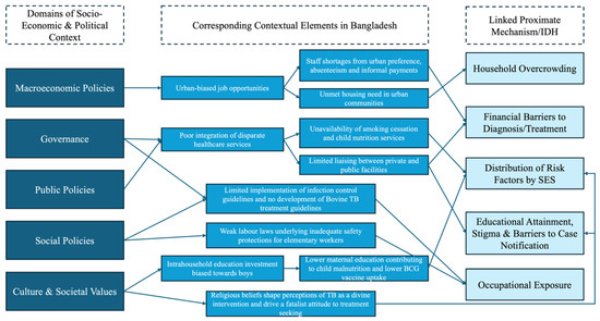 The mechanisms identified in this review correspond to IDHs of the WHO SDH Framework, as they are the most proximal factors influencing health equity and represent the intersection of structural determinants and contextual influences (Figure 1). Contextual factors—including macroeconomic policies, governance, social policies, public policies, and cultural and societal values—shape IDHs (Figure 8) and, consequently, inform potential interventions to address the inequitable burden of TB in Bangladesh.