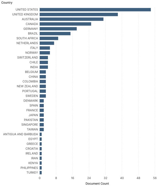 Figure 4 illustrates the dominance of the Global North in scientific production on the topic of PHAE, with publications from the United States (52), the United Kingdom (37), Australia (31), Canada (25), and Germany (18) accounting for 84% of the selected research publications. Among the countries of the Global South, Brazil (15), South Africa (9), Chile (4), India (4), China (3), and Colombia (3) are particularly noteworthy.