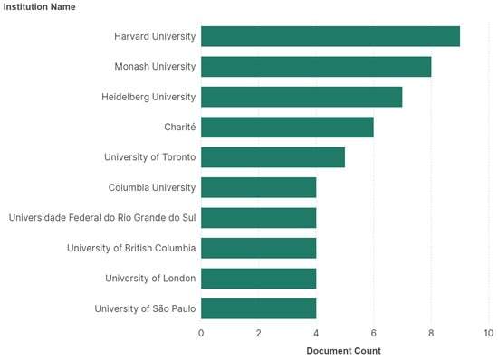 The institutions with the most significant number of publications are Harvard University (9), Monash University (9) and Heidelberg University (7). Note that the Universidad Federal do Rio Grande do Sul (4) and University of São Paulo (4) in Brazil are also represented in the list (Figure 5).