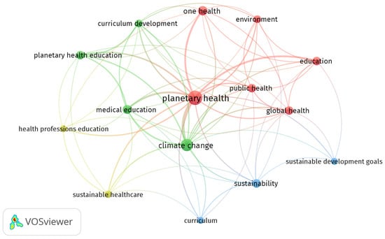 Three clusters were identified: Cluster 1 (red) revolves around the keyword “planetary health” and includes education, environment, global health, one health, and public health. Cluster 2 (green) focuses on the keyword climate change and integrates the terms curriculum development, medical education and planetary health education. Cluster 3 (blue) encompasses curriculum, sustainability, and sustainable development goals. Cluster 4 (yellow) includes health professions education and sustainable healthcare.