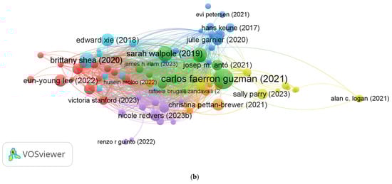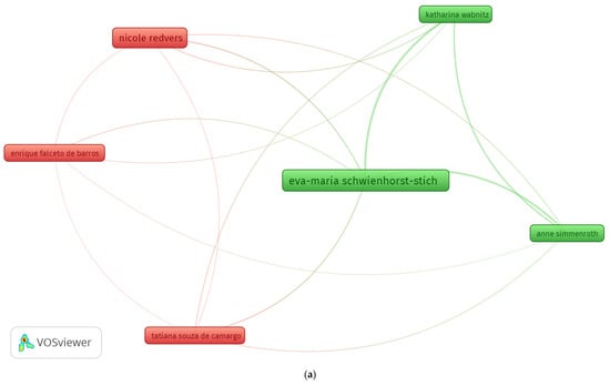 Bibliographic coupling was made in two ways. Firstly, the term “authors” was used as the unit of analysis, specifically those with at least four documents and five citations. Out of 1091 authors, 6 met the threshold. Author Eva-Maria Schwienhorst-Stich has the most significant number of publications (10) with 100 citations. Authors Nicole Redvers (7 publications, 263 citations) and Enrique Falceto de Barros (4 publications, 246 citations) are the most influential, according to the review, based on the number of citations. Cluster 1 (red) links the authors Enrique Falceto de Barros, Nicole Redvers and Tatiana Souza de Camargo. Cluster 2 (green) links Eva-Maria Schwienhorst-Stich with Anne Simmenroth and Katharina Wabnitz (Figure 7a).