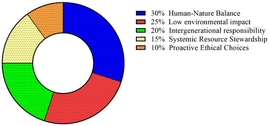 A qualitative analysis of the students’ definitions of sustainability revealed five dominant themes (Figure 1). The first was “Human-Nature Balance”, emphasizing ecological reciprocity, for example, “consumption aligned with regeneration.” The second was “Low environmental impact”, focusing on reducing pollution and preserving ecosystems. The third was “Intergenerational responsibility”, highlighting fair access to resources for future generations. The fourth was “Systemic Resource Stewardship”, referring to circular models of production and consumption. The fifth was “Proactive Ethical Choices”, linking individual behaviors, such as dietary changes, to collective environmental outcomes. The prevalence of environmental metaphors (89% of responses) versus socio-economic considerations (11%) reveals a significant imbalance in student perceptions.