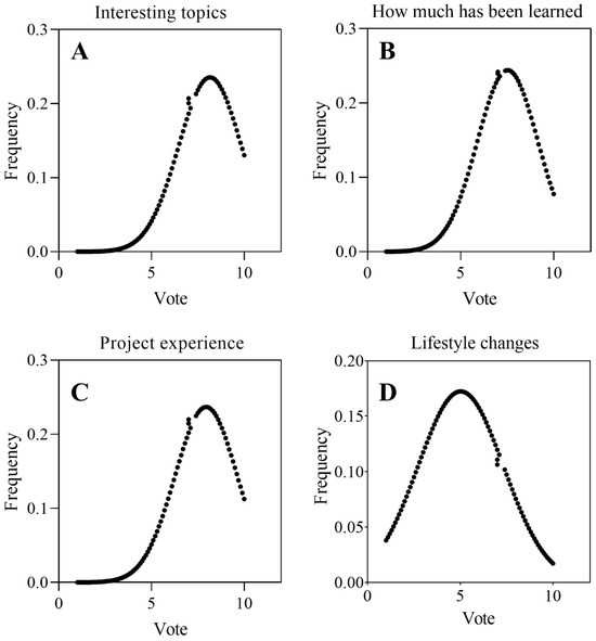Post-intervention evaluations revealed significant cognitive and affective gains. Participants rated their overall project experience positively (7.95 ± 1.69 on a 10-point scale) (Figure 2C), with particularly high scores regarding the interest aroused by the topics covered (8.16 ± 1.69) (Figure 2A) and knowledge retention (7.53 ± 1.63) (Figure 2B). However, self-reported lifestyle changes showed more modest shifts (5.03 ± 2.31) (Figure 2D), suggesting that while behavioral modifications remain incremental, the intervention successfully enhanced environmental consciousness.