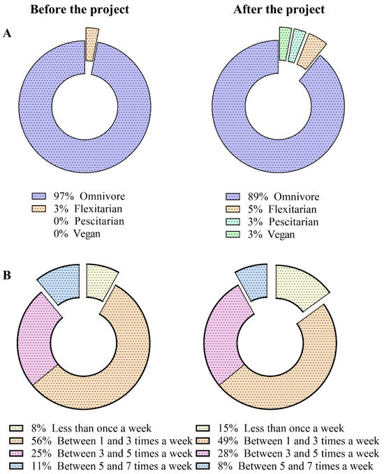 Regarding protein sources, meat remained the primary choice, with vegan alternatives consumed by only 14% of participants at baseline. However, by the end of the project, the proportion of students consuming vegan alternatives nearly doubled to 26% (p = 0.0339). Neither the type of meat consumed (p = 0.0602) nor the frequency of red-meat consumption (p = 0.3784) changed significantly, although there was a modest trend toward increased white-meat preference and a slight reduction in overall meat intake per week (from 2.82 times per week to 2.66 times per week) (Figure 3B).