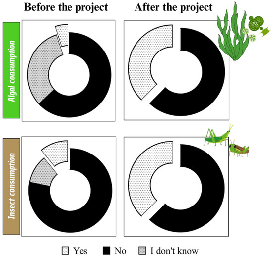 At project conclusion, 38% of students had sampled both algae and insects, compared to only 5% and 11%, respectively, at baseline. Before the project, only 11% were unsure if they had ever eaten insects, versus 32% for algae. This discrepancy may reflect sociocultural factors—entomophagy has been heavily debated in public forums and covered by social media, whereas algae, despite widespread use in supplements and Asian cuisines (e.g., nori in sushi), are less often recognized as such. For example, Spirulina (Arthrospira platensis) is the world’s most produced and consumed microalga, yet food labels frequently highlight “plant-based protein” without naming algae explicitly, making the term “algae” less common in food marketing than “insect.”