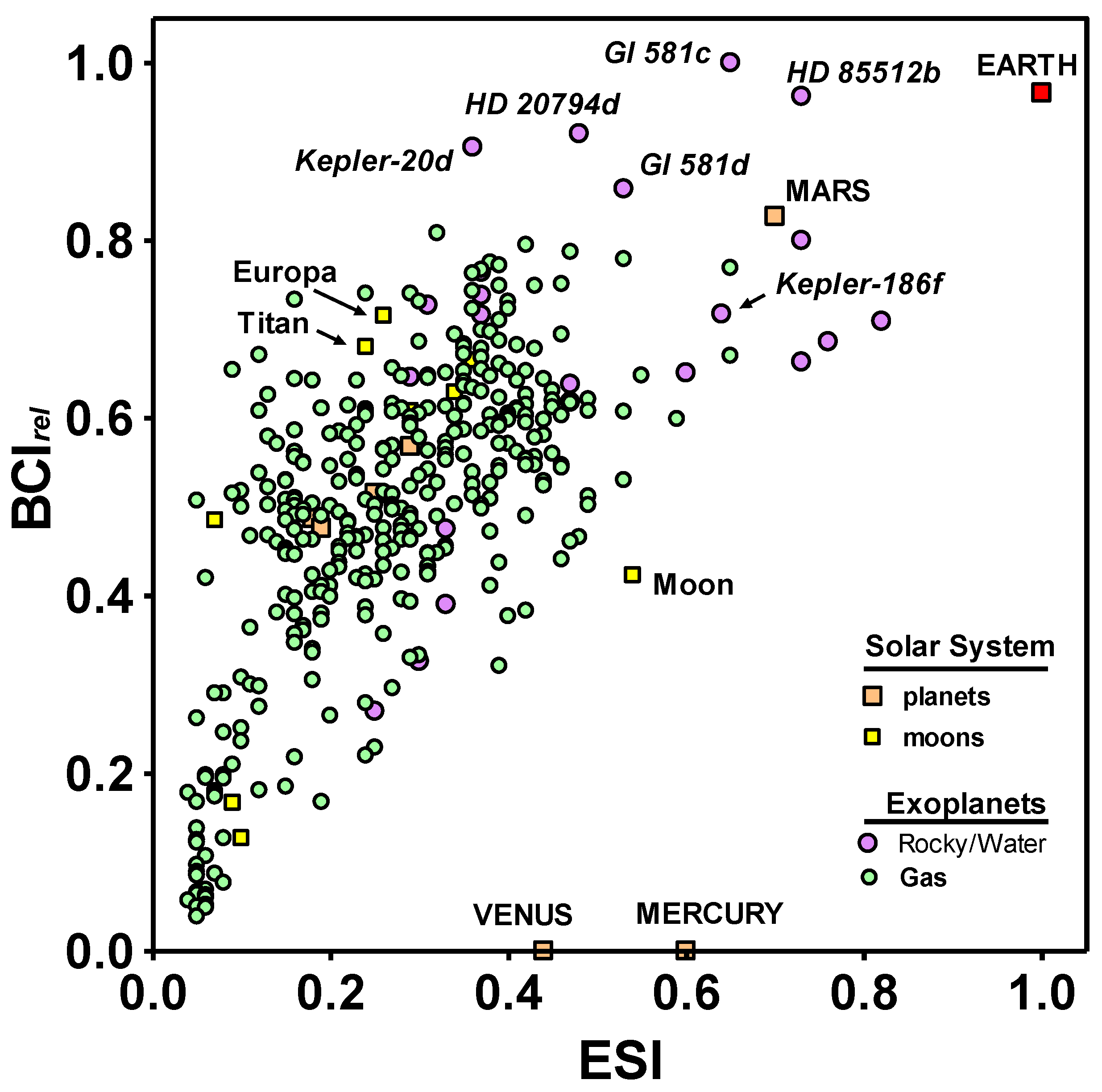 Exoplanets for which the BCIrel > 0.50 are listed in Table 1, along with equivalently ranked Solar System bodies. The highest BCI value is for Gliese 581c, followed by Earth, followed by HD 85512b, HD 20794d, Kepler-20d, and Gliese 581d, then by Mars, five more exoplanets, and Europa. Of the 637 exoplanets in the sample here considered, 10 (1.6%) have BCI values higher than for Europa, and five (0.8%) have BCI values higher than for Mars.
