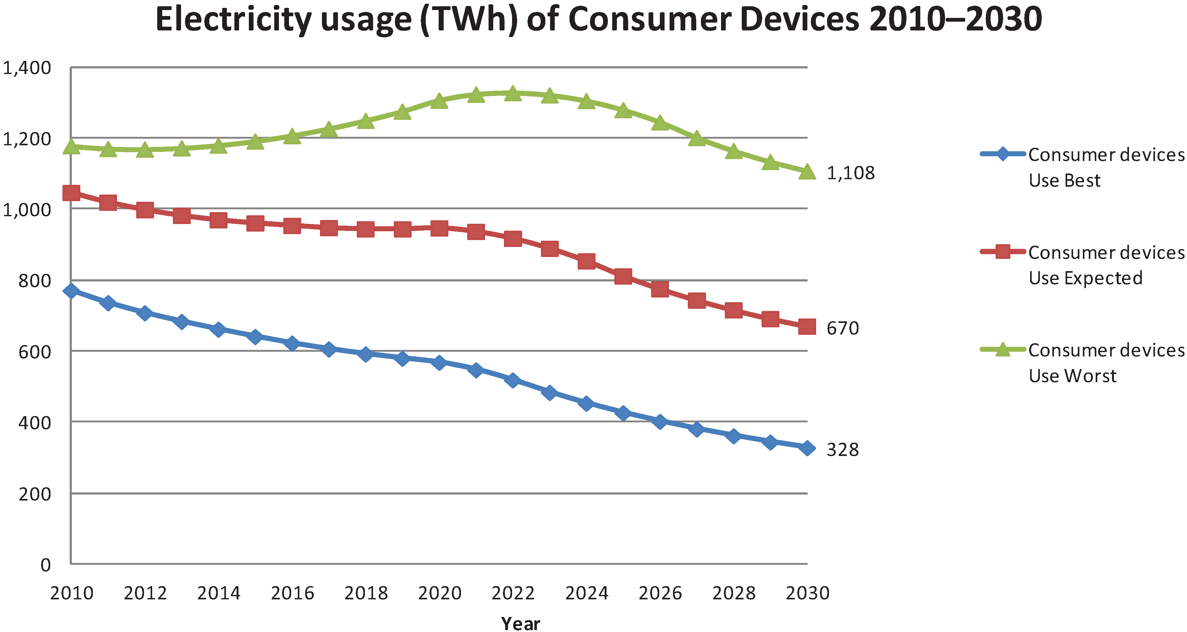 Below in Figure 1 is shown the global electricity demand for consumer devices use stage. The details for Figure 1 are shown in the Supplementary Materials file, sections “Cons Dev Best”, “Cons Dev Expe” and “Cons Dev Worst”.