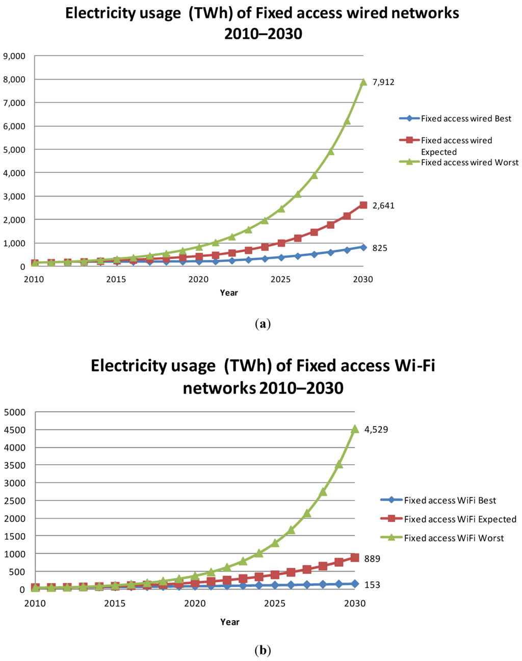 - Fixed access networks (FAN) use: FAN consists of Fixed access wired and Fixed access Wi-Fi. A framework is set up based on the expected annual growth of fixed access wired data traffic and fixed access Wi-Fi data traffic between 2010 and 2030 and the improvements of electricity efficiency to be expected year by year from 2010 to 2030, and assumed known values for the 2010–2012 electricity of the defined FAN scope. The same framework is applied to both fixed access types.
