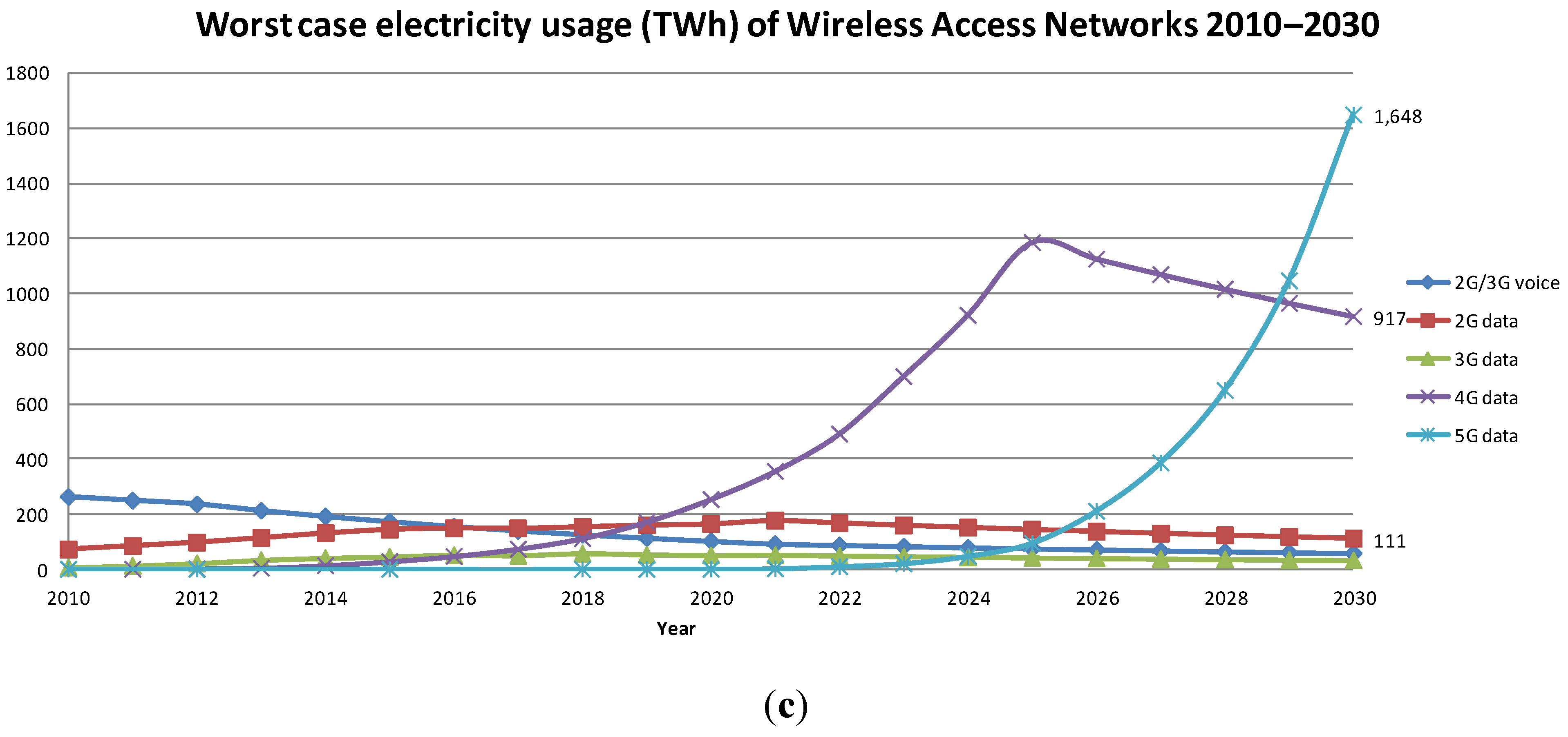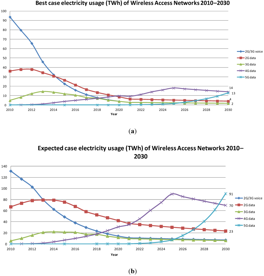 - Wireless access networks (WAN) use: A framework is set up based on the annual growth of voice traffic; the growth of mobile data traffic; electricity used per traffic unit for each of voice; second-generation (2G) wireless telephone technology data, third generation (3G) data, fourth generation (4G) data and fifth generation (5G) data; share of the before mentioned technologies of the total wireless traffic year by year from 2010 until 2030; and improvements of electricity efficiencies to be achieved year by year.