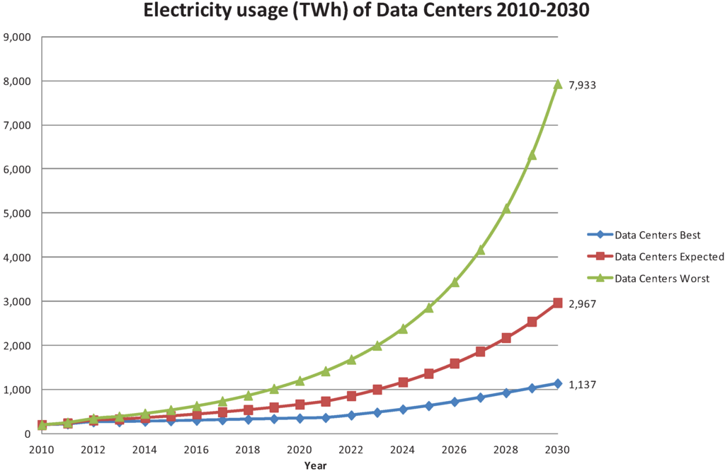 - Data centers use: A framework is set up based on expected annual growth of global data center Internet Protocol (IP) traffic between 2010 and 2030, electricity used per traffic unit, and improvements of electricity efficiencies to be achieved year by year.
