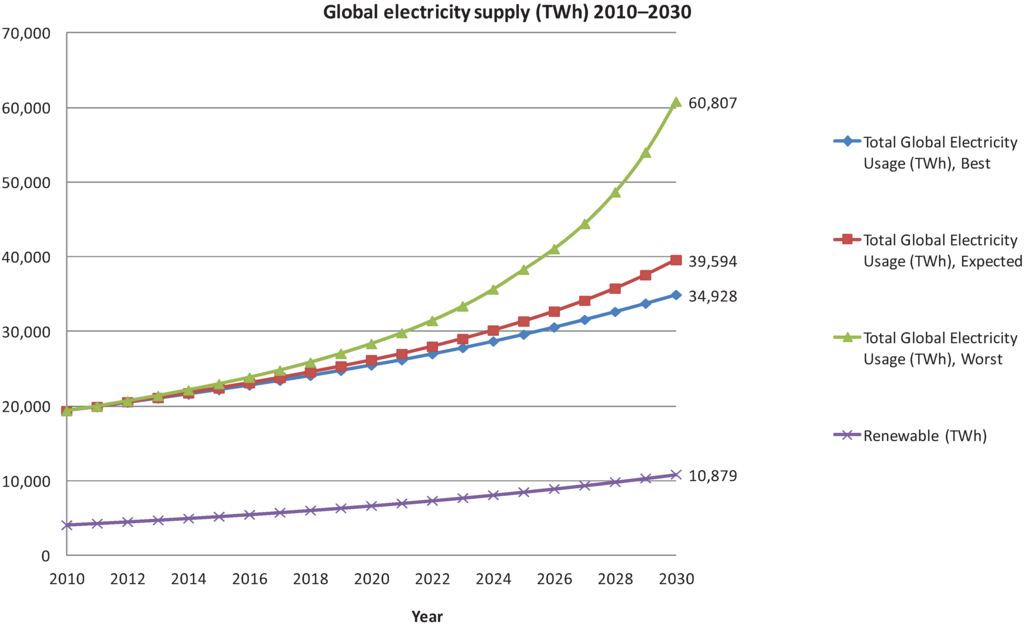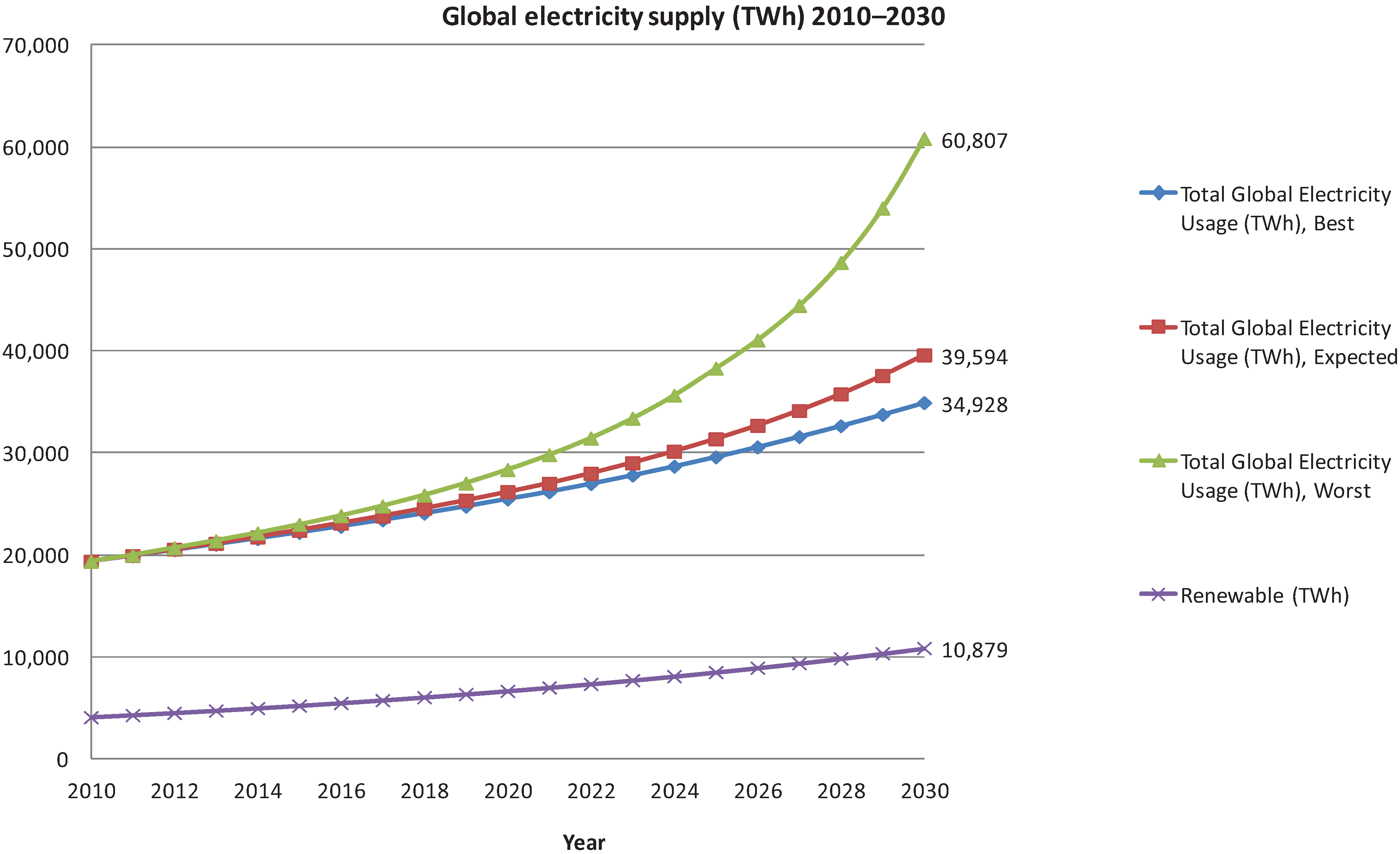 - Global electricity: The estimation is based on a known starting value for 2010 and an annual growth rate for non-CT electricity. CT electricity (ECT) grows according to the present investigation.